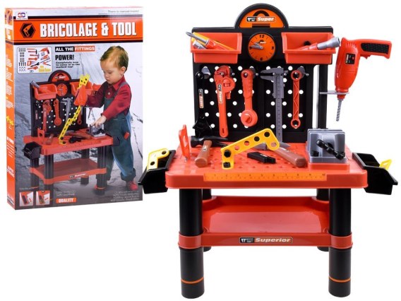 Kreatywny zestaw dla małego majsterkowicza przyda się w każdym domowym warsztacie, garażu. Zestaw składa się ze stolika, na którym można naprawiać zepsute sprzęty domowe, dodatkowo stolik został wzbogacony o szufladki do przetrzymywania śrubek, nakrętek lub innych niezbędnych akcesoriów, posiada ściankę do zwieszania narzędzi, aby móc utrzymać zawsze ład i porządek. Imadło, które znajduje się na blacie jest niezbędne podczas przytrzymania jakiejś rzeczy w trakcie naprawy. Zestaw oczywiście zawiera wszystkie niezbędne narzędzia potrzebne do napraw. Cały kompletny warsztat wykonany został z plastiku w kolorze pasującym do każdego garażu.