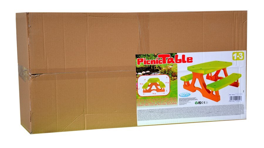 Stolik piknikowy dla dzieci polskiej firmy MOCHTOYS 10722 Stolik z dwoma ławeczkami i dużym blatem. W stoliku został wykonany specjalny otwór umożliwiający montaż parasola. Wymiary opakowania: 47 cm x 80 cm x 21,5 cm Wymiary stolika: - szerokość blatu 43,5 cm - szerokość ławki 17 cm - szerokość całkowita 79 cm - długość całkowita 78 cm - wysokość całkowita 47 cm Maksymalne obciążenie ławek 25 kg.