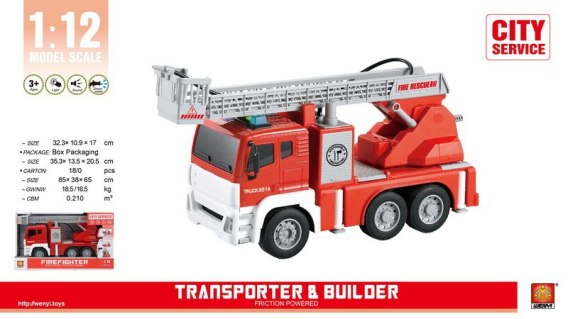 Interaktywna straż pożarna z funkcją dźwięku i światła, oraz lejącą się wodą dla dzieci od 3-go roku życia. Wóz strażacki został wykonany z najlepszej jakości materiałów w żywych kolorach. Posiada ruchome elementy takie jak regulowana drabina w górę i w dół, a także wydłużana i skracana. Na końcu drabiny znajduje się platforma z końcówką węża strażackiego, z którego leci woda. Na początku przyczepy, umieszczony jest zbiornik na wodę. Po napełnieniu zbiornika wodą wystarczy przycisnąć przycisk znajdujący się na górze zbiorniczka a poleci woda. Na dachu kabiny wozu strażackiego znajdują się przyciski, po naciśnięciu, na które usłyszymy sygnał syreny, klakson lub odgłos odpalania pojazdu. Odgłosom towarzyszy miganie światełek na dachu pojazdu. Pojazd posiada gumowe opony i napęd frykcyjny na przedniej osi. Zasilany jest bateriami typu 3 x AG13 (w zestawie).