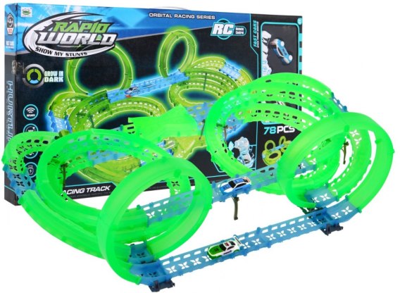 Świecący w ciemności Tor wyścigowy dla dzieci 3+ Pętle 360 + 2 autka LED + 2 piloty