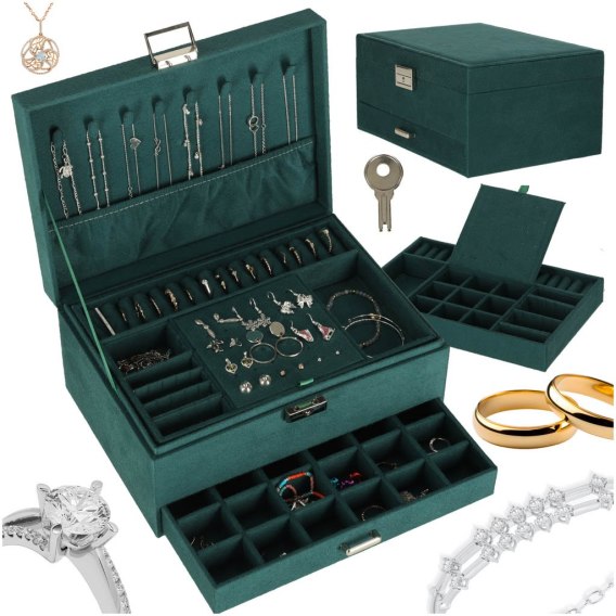 Szkatułka w eleganckim zielonym kolorze spodoba się zarówno estetom, jak i osobom preferującym praktyczne akcesoria. Posiada przegródki z wyjmowanymi ściankami, co pozwala komfortowo urządzić przestrzeń według własnych potrzeb.