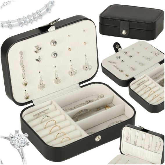 To stylowa kasetka na biżuterię w eleganckiej, klasycznej czerni z kontrastowym jasnym wnętrzem, która doskonale wpasuje się w wystrój każdej toaletki. To nowoczesna szkatułka, która łączy w sobie kompaktowy rozmiar z imponującą funkcjonalnością i zaskakującą pojemnością. Dzięki przemyślanemu układowi przegródek, haczyków i miejsc na pierścionki oraz kolczyki, pozwala wygodnie przechowywać różne elementy biżuterii, zapewniając jednocześnie bezpieczne przechowywanie nawet większej kolekcji dodatków. Idealny wybór dla miłośniczek biżuterii, które chcą połączyć styl, nowoczesny design i praktyczne rozwiązania w jednym organizerze.