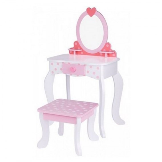 Drewniana toaletka dziecięca z krzesłem od marki TOOKY TOY. Każda dziewczynka zasługuje na piękną toaletkę z dużym lustrem oraz krzesłem w swoim pokoju dziecięcym, która pozwoli jej codziennie wyglądać pięknie. Toaletka została wykonana z litego drewna, ozdobiona białymi i różowymi kropkami.
