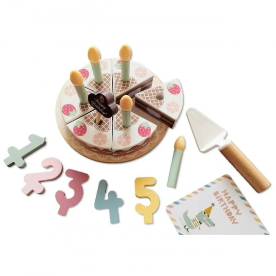 Drewniany Piękny Czekoladowy Urodzinowy Tort z truskawkami i bezami marki Tooky Toy to nie tylko uroczy dodatek do dziecięcej kuchni, ale także doskonały element dekoracyjny na przyjęciu urodzinowym. Składa się z 20 starannie wykonanych drewnianych elementów, każdy fragment tortu łączy się ze sobą za pomocą wytrzymałych rzepów, zapewniając solidną konstrukcję. Dodatkowo zestaw zawiera świeczki, cyfry od 1 do 5, kartkę urodzinową oraz specjalną łyżkę do ciasta.