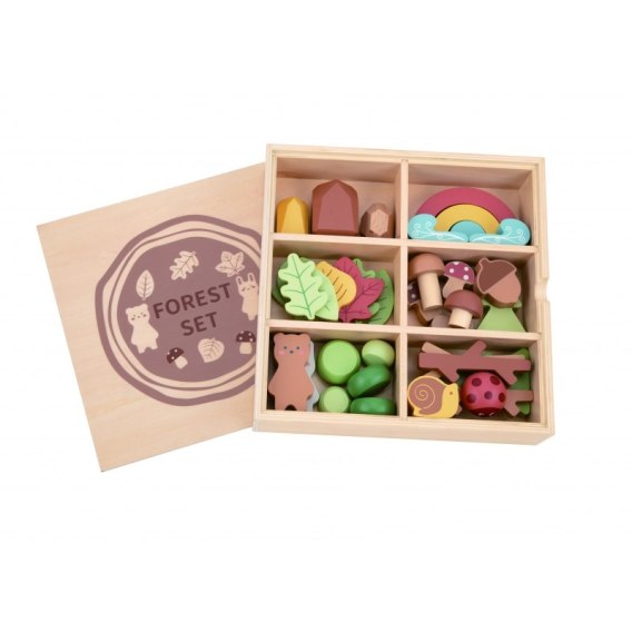 Odkryj magiczny las w domowym zaciszu! Zestaw Leśny marki Tooky Toy to starannie wykonany, drewniany zestaw otwartej zabawy, w którym dzieci budują własną leśną krainę: drzewa, listki, grzybki, zwierzątka, tęczę, fale i kamienie. Ciepłe kolory, gładkie, przyjemne w dotyku elementy oraz stonowane kolory zachęcają do twórczej zabawy. Całość mieści się w solidnej, drewnianej skrzyneczce z 6 przegrodami i pokrywką, której odwrotna strona została wykonana w formie tablicy kredowej.