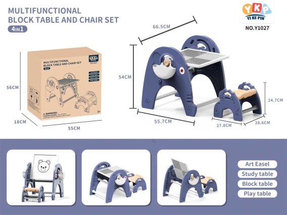 Zestaw 4 w 1, tablica, stolik, podkładka do układania klocków i krzesełko dla dzieci od 3-go roku życia. Zestaw wykonany został z najlepszej jakości plastiku, nie posiada ostrych krawędzi i jest stabilny. Na plastikowych nóżkach umieszczona jest tablica, którą można pochylać pod dowolnym kątem i obracać. Z jednej strony mamy tablicę do malowania a z drugiej podkładkę do układania klocków. Z tablicy i podkładki możemy korzystać w pozycji pionowej lub poziomej. W pozycji poziomej możemy korzystać z zestawu jak ze stolika do malowania, nauki czy jedzenia lub podstawki na klocki. Do zestawu dołączono gąbkę oraz 6 mazaków. Po bokach zestawu znajdują się również dwa kosze na przybory do malowania. Zestaw rozwija wyobraźnie i umiejętności poznawcze dzieci. Funkcje zestawu: - przeznaczony dla dzieci od 3-go roku życia, - wykonany z bezpiecznych materiałów, nie posiada ostrych krawędzi, - wiele możliwości zabawy: * stolik do malowania, * stolik do nauki lub zabawy, * podstawka do układania klocków, * tablica do malowania, - stabilne krzesełko, - rozwija wyobraźnię i umiejętności poznawcze dzieci. |