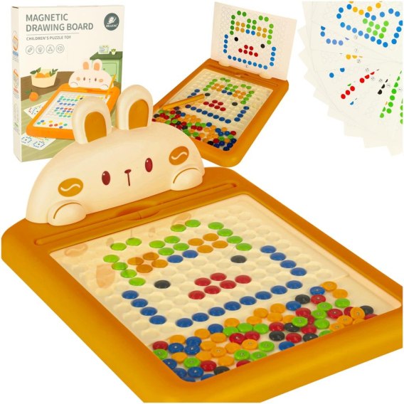 Tablica magnetyczna posiada kolorowe guziki, które można przesuwać przy pomocy magnetycznego długopisu i układać w przeróżne mozaiki, wzory i obrazki. Dziecko może wzorować się na dostępnych przykładach lub samodzielnie wymyślać nowe dzieła. Na tablicy znajduje się króliczek, który będzie towarzyszył maluchowi podczas zabawy.