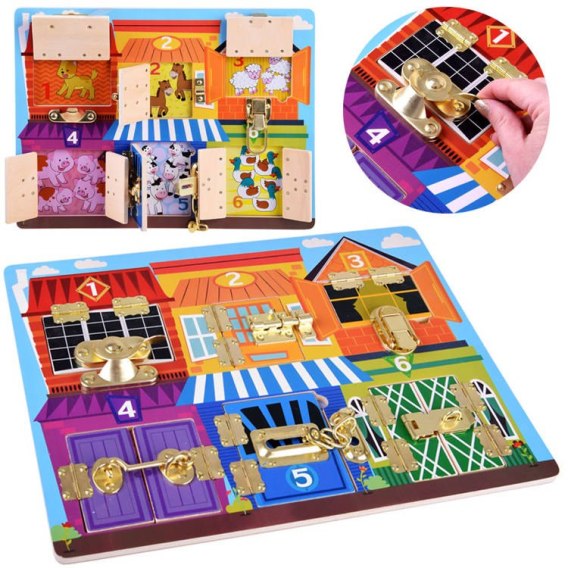 Zabawa, nauka, zamykanie, otwieranie, zamki, zabawka ogólnorozwojowa, tablica sensoryczna, manipulacyjna, motoryczna