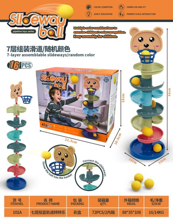 Wielobarwny tor z misiem i piłeczkami dla dzieci od trzeciego roku życia. Zabawka składa się z podstawy, 6 pięter oraz głowy misia z koszem. Można ją dowolnie modyfikować przez dodawanie i odejmowanie dodatkowych pięter. Im wyższa wieża, tym trudniej trafić do kosza. W zestawie znajdują się 7 piłeczek.