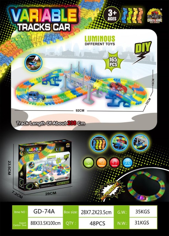 Tor wyścigowy świecący w ciemności z autkiem w zestawie to propozycja dla dzieci już od trzeciego roku życia. Tory są elastyczne, można je układać w dowolne kombinacje, obracać, podnosić, przekładać i to podczas jazdy autka. Dodatkowo tory są fluorescencyjne, świecą w ciemności. Pojazd dołączony do zestawu, posiada podświetlenie LED, jeżdżąc w ciemności, tworzy niesamowity efekt. Pojazd zasilany jest bateriami 2 x AA 1,5V (brak w zestawie). Aby uruchomić autko, wystarczy nacisnąć na jego dachu przycisk.