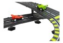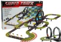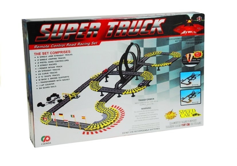 Tor samochodowy o długości 1157 cm z pętlami, zasilaczem sieciowym 230 V, licznikiem okrążeń, bandami, które zabezpieczają przed wypadnięciem samochodzików, mostem, trybunami oraz tunelem, "górami", "wodospadem" wśród których odbywa się pasjonujący wyścig. Tor wykonany jest z bardzo dobrego plastiku. Bardzo łatwy w montażu jak i demontażu toru. Posiada w zestawie zasilacz 220-230 V więc nie wydajesz pieniędzy na baterie. Zabawa polega na tym samym co wyścigi samochodowe - musisz pierwszy przejechać jak największą ilość okrążeń i dojechać do mety. Tor posiada liczniki okrążeń, które liczą ilość okrążeń, a Ty możesz jeździć na czas jak w formule. Na torach ostre zakręty zaznaczono żółtym kolorem, na torach są namalowane pasy - białym kolorem.