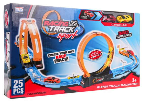Tor wyścigowy z dwoma pętlami 360 stopni dla dzieci od 3-go roku życia. Tor wykonano z najlepszej jakości plastiku w żywych kolorach. Na zestaw składa się 25 elementów do samodzielnego montażu. Tor posiada odcinki proste do rozpędzenia pojazdu, 2 pętle 360 stopni i dwa pojazdy. Pojazdy napędzane są napędem pull back. Wystarczy delikatnie nacisnąć pojazd do tyłu, by przejechał tor z pełną mocą. Funkcje toru: - odpowiedni dla dzieci od 3-go roku życia, - wykonany z najlepszej jakości plastiku w żywych kolorach, - pojazdy z napędem pull back. |