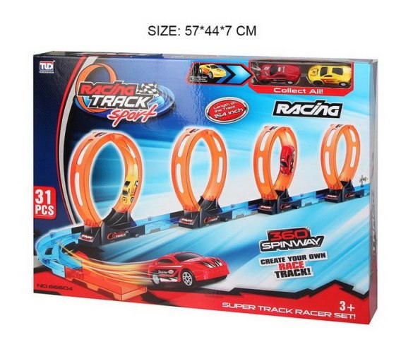 Tor wyścigowy z czterema pętlami 360 stopni, dla dzieci od 3-go roku życia. Tor wykonano z najlepszej jakości plastiku w żywych kolorach. Na zestaw składa się 31 elementów do samodzielnego montażu. Tor posiada odcinki proste do rozpędzenia pojazdu, 4 pętlę 360 stopni i dwa pojazdy. Pojazdy napędzane są napędem pull back. Wystarczy delikatnie nacisnąć pojazd do tyłu, by przejechał tor z pełną mocą. Funkcje toru: - odpowiedni dla dzieci od 3-go roku życia, - wykonany z najlepszej jakości plastiku w żywych kolorach, - 4 pętle 360 stopni, - pojazdy z napędem pull back, |