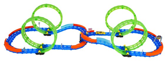 Fluorescencyjny tor wyścigowy z ostrymi zakrętami, pętlami i szybkim autkiem to propozycja dla dzieci od trzeciego roku życia. Zestaw składa się z 86 elementów do samodzielnego montażu. Na torze znajdują się odcinki proste, ostre zakręty z barierkami zabezpieczającymi przed wypadaniem pojazdu z trasy, a także cztery pętle 360 stopni. Pętle są fluorescencyjne, świecą w ciemności. Autko również posiada oświetlenie w tylnej części. Autko zasilane jest bateriami typu 2 x AA A1,5 V, baterii brak w zestawie.