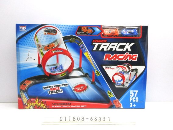 - 2 autka z napędem pull back, - części składowe toru, - instrukcja montażu, - naklejki dekoracyjne. |