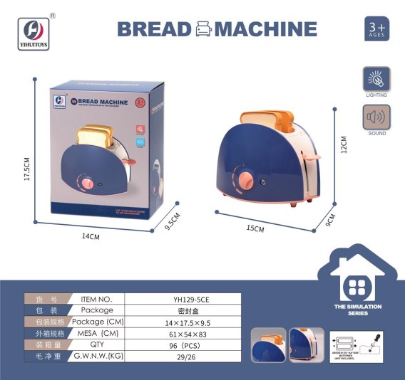 Toster z wyskakującymi tostami i efektem dźwięku i światła dla dzieci od trzeciego roku życia. Zabawkę wykonano z najlepszej jakości tworzywa sztucznego z dbałością o szczegóły. Świetnie odwzorowuje prawdziwy. Należy włożyć zabawkowe tosty, a po paru sekundach same wyskoczą. Podczas pieczenia tostów słychać odgłosy pieczenia i pulsuje światełko na przodzie tostera. W zestawie znajduje się toster i 2 tosty. Zabawka zasilana jest bateriami typu 2 x AA 1,5 V (brak w zestawie). Funkcje: - dla dzieci od trzeciego roku życia, - wykonany z najlepszej jakości tworzywa sztucznego, - efekty światła: pulsująca dioda podczas pieczenia tostów, - efekty dźwiękowe: odgłosy smażenia tostów, - 2 tosty w zestawie, - po upieczeniu tosty wyskakują z tostera, - regulowane pokrętło. |
