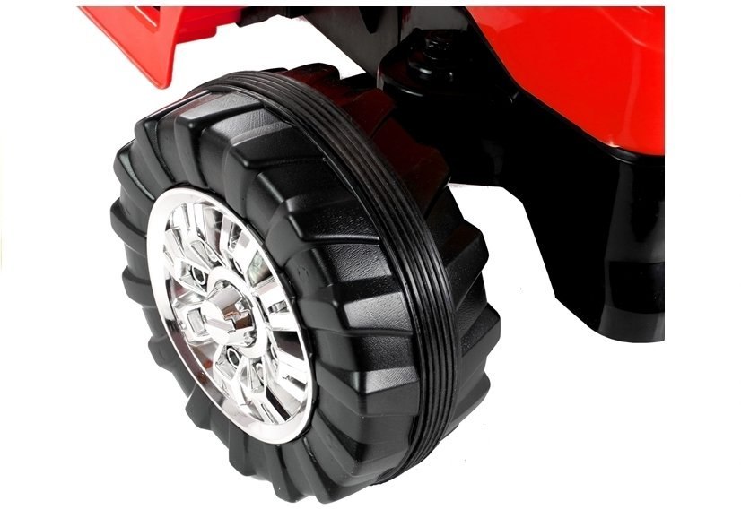 Czerwony traktor ZP1005 dla dzieci został wykonany z atestowanego, trwałego materiału, który pozwoli maluchowi na częste zabawy. Jego konstrukcja oparta jest na szerokich, bieżnikowanych kołach z plastiku, na których znajduje się specjalna opaska. Dzięki niej pojazd nie wytwarza dużego hałasu podczas jazdy, a ponadto poradzi sobie — jak to maszyna do zadań specjalnych — na nawierzchni różnego typu. Prędkość, jaką może osiągnąć koparka dla kilkulatków, mieści się w granicach od 3 do 5 km/h, co jest gwarancją rozrywki na najwyższym poziomie. Obsługa pojazdu jest bardzo prosta — wystarczy, że mały kierowca po wygodnym usadowieniu się na fotelu wciśnie czerwony guzik startu, a swoją nóżkę ustawi na pedale gazu. Po jego dociśnięciu czerwony traktor na akumulator ruszy przed siebie — zabawa gwarantowana.