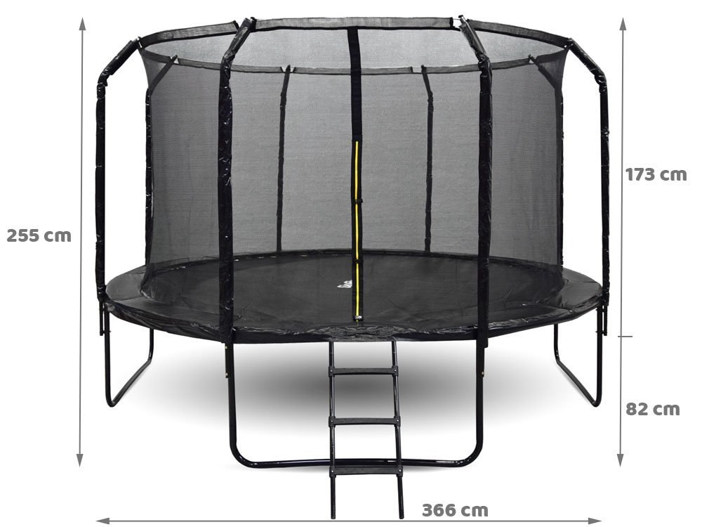 Trampolina ogrodowa SkyFlyer Black 366 cm z siatką i profilowanymi słupkami to propozycja dla wszystkich lubiących i ceniących sobie dobry ruch. Nie od dziś wiadomo, że ruch to zdrowie, endorfiny, pozytywne nastawienie, wszystko co dobre. Dlatego taka trampolina we własnym ogrodzie to fantastyczny motywator do wprawiania własnego ciała w ruch! Nie ma na co czekać właśnie ta trampolina pozwoli Tobie i Twoim dzieciom być w świetnej kondycji i formie.