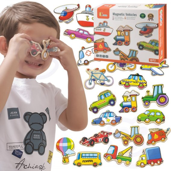 Drewniany zestaw magnesów Pojazdy od firmy Viga Toys zawiera 20 różnych pojazdów