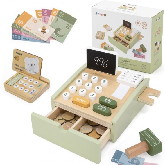 Kasa sklepowa to świetna drewniana zabawka, która pozwoli na odegranie wielu scenek, jakie mogą mieć miejsce w sklepie. Dzieci mogą wcielić się w role kasjera, lub klienta, oraz wspólnie ćwiczyć interakcje społeczne, oraz swoje zdolności komunikacyjne. Gotówka, czy karta? Policz sumę należności, przyjmij pieniądze i wydaj poprawnie resztę. Kasa zawiera banknoty, monety, oraz kartę płatniczą. Dziecko może uczyć się bawiąc! Królowa Nauk - matematyka nie będzie już straszna.