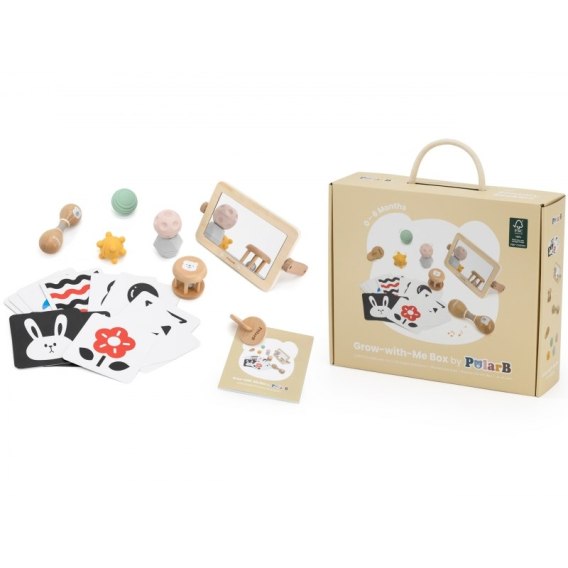 Grow-with-Me Box (0-6M) to zestaw sensoryczny stworzony specjalnie dla maluszków, aby wspierać ich rozwój od pierwszych dni życia. W pudełku znajdziesz zabawki, które stymulują wzrok, słuch i dotyk, pomagając w rozwijaniu koordynacji i umiejętności motorycznych. Każdy element został wykonany z najwyższej jakości materiałów, w tym drewna certyfikowanego przez FSC, co gwarantuje bezpieczeństwo i trwałość. To idealne rozwiązanie dla rodziców szukających kompleksowego wsparcia rozwojowego dla swojego dziecka.