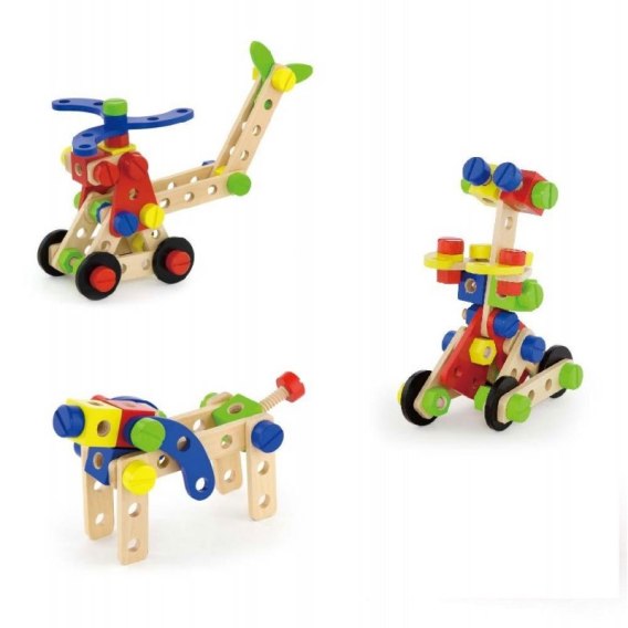 Drewniane, konstrukcyjne klocki od firmy Viga, sprawią mnóstwo radości i zajmą dziecko zabawą na wiele godzin. Zestaw zawiera 68 klocków, z których można skonstruować samolot, robota, samochód i wiele innych rzeczy, a w tym wszystkim pomoże książeczka z instrukcjami, która dołączona jest do zestawu.