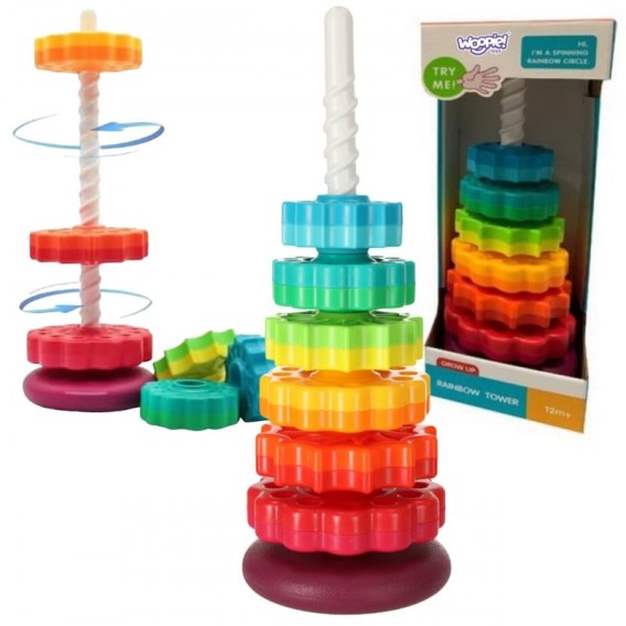 Zakręcona wieża od marki WOOPIE to wyjątkowa zabawka dla dzieci, która wprowadza maluszki w świat fascynujących kolorów, kształtów i ruchu. Składa się z kolorowych elementów, które umieszczamy na drążku wkręcając je. Ta piramida nie tylko bawi, ale również edukuje, wspierając wszechstronny rozwój dziecka. Dzięki solidnemu wykonaniu z bezpiecznych materiałów, zakręcona wieża zapewnia trwałą i bezpieczną zabawkę, która z pewnością zainteresuje Twojego maluszka na długie godziny. Zestaw składa się z 6 krążków w różnych kolorach i kształtach oraz drążka umieszczonego na podstawce. Elementy są dwukolorowe, aby urozmaicić układanie krążków w wieżę na różne sposoby. Składanie piramidy wymaga od dziecka logicznego myślenia i planowania kolejnych kroków.
