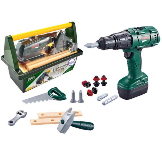 Skrzynka z narzędziami wraz z wkrętarko - wiertarką została stworzona przez uwielbianą przez dzieci firmę WOOPIE. W skład zestawu wchodzi ciemno-zielona, pojemna skrzynka na narzędzia z wygodną, żółtą rączką oraz 15 elementów. Wśród narzędzi dzieci odnajdą bezprzewodową wkrętarko-wiertarkę na baterie z 3 wymiennymi końcówkami. Wkrętarko-wiertarka naśladuje prawdziwe urządzenie, dzięki dźwiękom oraz obrotowemu wkrętowi. Ponadto w zestawie znajduje się piła z wygodnym uchwytem, młotek, klucz francuski, dwie plastikowe deseczki z otworami do wkręcania śrub (4 w zestawie) lub wbijania gwoździ (2 w zestawie). Ten zestaw zapewni wspaniałą zabawę każdemu małemu majsterkowiczowi, wspomagając przy tym rozwój zdolności manualnych.