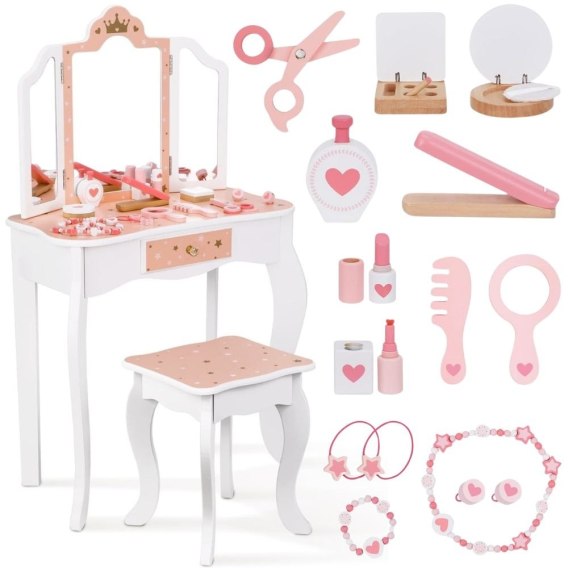Drewniana toaletka z akcesoriami dla dzieci od Woopie Green to niezwykle urocza i dopracowana w każdym szczególe zabawka, która przenosi dzieci w świat wyobraźni, piękna i kreatywnej zabawy. Zaprojektowana z myślą o najmłodszych miłośniczkach stylu i estetyki, stanowi nie tylko piękny mebel do pokoju, ale również narzędzie wspierające rozwój emocjonalny, społeczny i manualny dziecka. Toaletka zachwyca eleganckim designem inspirowanym klasycznymi meblami dorosłych - ma kształt delikatnego biureczka z potrójnym lustrem, szufladką na drobiazgi i wygodnym stołeczkiem dopasowanym do wzrostu dziecka. Całość wykonana jest z wysokiej jakości drewna,w odcieniach różu, bieli i złota.Trzyczęściowe lustro z ruchomymi skrzydłami umożliwia przeglądanie się z różnych stron, a szeroki blat zapewnia dużo miejsca na wszystkie niezbędne dodatki. W zestawie znajduje się również bogaty komplet akcesoriów, dzięki którym zabawa staje się jeszcze bardziej realistyczna.