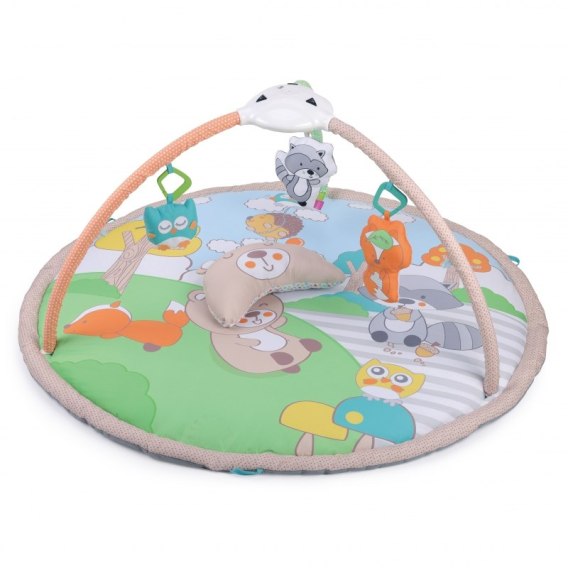 WOOPIE Interaktywna Mata Edukacyjna dla Dzieci z projektorem wpływa pozytywnie na rozwój wszystkich zmysłów u niemowlaka. Nasza mata to świetne miejsce na relaks, zabawę i odkrywanie świata. Mata dla najmłodszych dzieci o średnicy aż 113 cm, w kolorze beżowym ze zwierzaczkami jest idealna dla każdego malucha. Posiada odczepianą pozytywkę z projektorem. Można jej używać razem z matą lub osobno. Do wyboru mamy 8 uspokajających melodii, natomiast projektor wyświetla na suficie gwiazdki i księżyc. Moduł może również emitować kolorowe światełka, które pobudzają ciekawość maluszka. W zestawie znajdują się 4 zabawki (jasno brązowy miś, niebieska sowa, ruda wiewiórka, szary szop), które pobudzają wszystkie zmysły. Można podwiesić je na pałąkach lub zastąpić innymi zabawkami. Mata jest bardzo łatwa w montażu oraz w czyszczeniu. Miękkie wypełnienie zwiększa poczucie komfortu. Produkt przeznaczony dla najmłodszych dzieci już od 1 miesiąca życia.