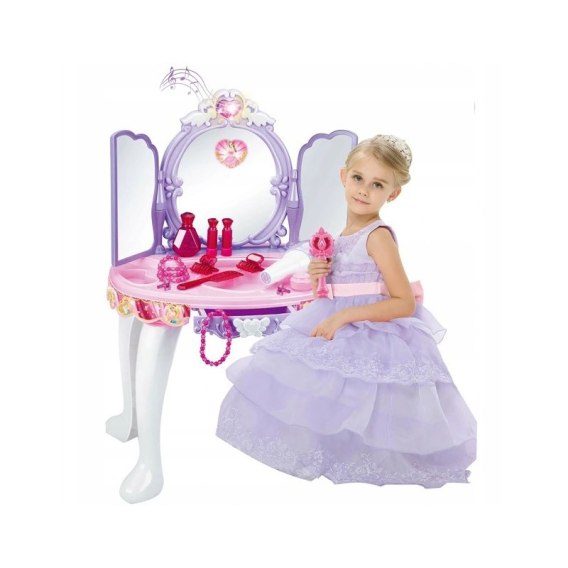 Śliczna dziecięca toaletka w dziewczęcej kolorystyce od Woopie to idealna propozycja na prezent dla dzieci od 3 roku życia. Rozbudowany zestaw do robienia makijażu oraz fryzur zadowoli każdą posiadaczkę. Skrzydła lustra otwierane za pomocą magicznej różdżki, która działa na podczerwień, tak aby dziewczynka mogła poczuć się jak prawdziwa wróżka. Na lusterku pokazuje się postać królewny. Toaletka wyposażona jest również w efekty dźwiękowe i świetlne. Podczas otwierania lusterek gra muzyczka i migają światełka, natomiast gdy dziecko nie używa toaletki lustra automatycznie zamykają się. Lustro wykonane jest z niezbijalnego tworzywa co zwiększa bezpieczeństwo dziecka. Dołączona do zestawu suszarka do włosów na baterie pomoże stworzyć bajeczne fryzury i przenieść w świat małych modelek. Zabawka może służyć jako uzupełnienie Salonu Urody małych dziewczynek w pokojach. W zestawie kabel MP3, dzięki czemu podczas zabawy można słuchać ulubionej muzyki.