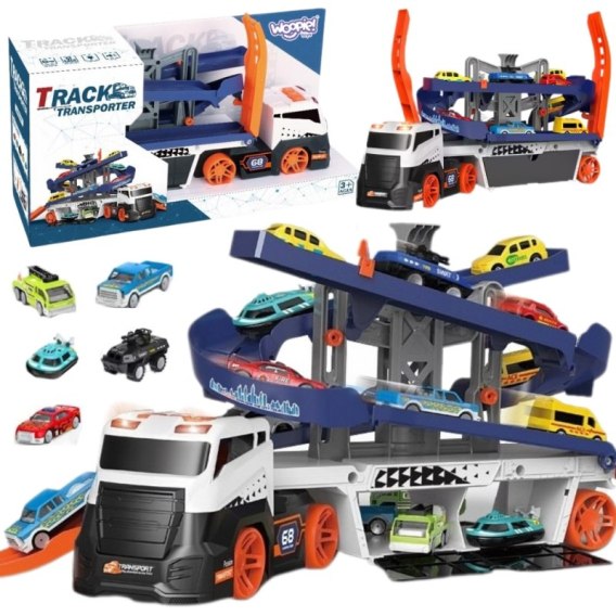 - - Zabawka posiada dodatkowy parking na górze naczepy, z którego dzieci mogą rozpędzać autka i wyskakiwać nimi, co wprowadza do zabawy element dynamiki i zręczności.