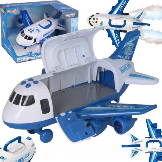 Interaktywny Samolot Policyjny od marki WOOPIE z pewnością zachwyci każdego małego fana akcji! Samolot został zaprojektowany z myślą o przewożeniu pojazdów, dzięki specjalnie dostosowanej przestrzeni ładunkowej, w której można umieścić samochody. Otwierany bok samolotu i schody pozwalają na włożenie autek do środka, z tylu samolociku znajduje się rampa na szybkie opuszczenie samochodów. Efekty dźwiękowe i świetlne dodają atrakcyjności naszemu podniebnemu pojazdowi. Cztery przyciski wydają odgłosy syreny policyjnej, odgłosy strzelania sprawią że twoje dziecko poczuje się jak na akcji policyjnej. Uchwyt na górze zabawki pozwala na wygodne szybowanie w przestworzach.