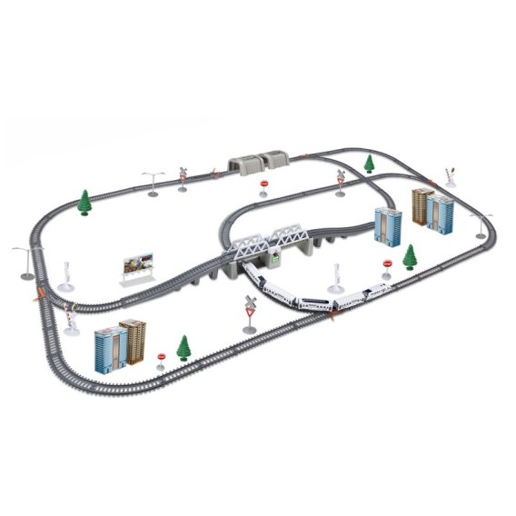 - - w skład zestawu wchodzi: pociąg Pendolino - 5-składowy, ruchomy, podnoszony most, tunel kolejowy, znaki, atrapy budynków mieszkalnych, szlabany, drzewka, latarnie,