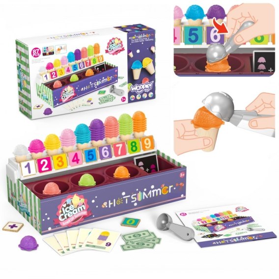 Zestaw Lodziarni od marki WOOPIE nie tylko pozwoli na zabawę w małego sprzedawcę lodów, ale również pozwoli na naukę liczenia, liczb, kolorów i dodawania. W zestawie znajdziemy 87 elementów, wśród których znajdziemy gałki lodów, wafelki, karty z zamówieniami, pieniądze, żetony z liczbami i łyżkę do lodów. Liczba gałek lodów różni się w zależności od koloru, a na kartach zamówień znajdziemy proste zadania matematyczne. Natomiast poprzez odgrywanie ról dzieci rozwijają swoje zdolności komunikacyjne, pozwolą zmniejszyć stres w codziennych sytuacjach, a także stanowią doskonałą lekcję empatii.