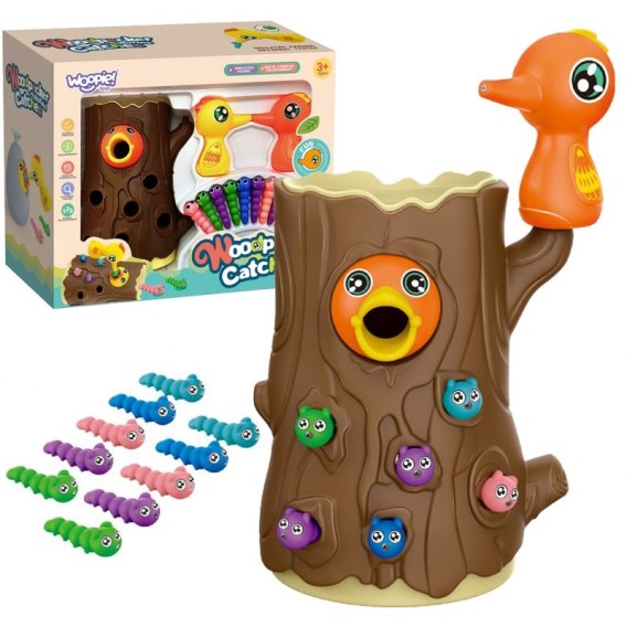 Gra Zręcznościowa Złap Robaczka od marki WOOPIE to doskonały sposób na wspólne spędzanie czasu z dzieckiem. Proste zasady oraz intuicyjna obsługa sprawiają, że zagrać w nią może praktycznie każdy. Zabawa polega na chwytaniu dzięciołem zakończonym magnesem robaczków ukrytych w otworkach znajdujących się w drzewie, a następnie na ich ponownym wkładaniu w dziób ptaszka. W zestawie: 2 dzięcioły do karmienia pisklaka, kłoda z pisklakiem i 10 robaków. Zestawem może się bawić jednocześnie dwoje dzieci. Gra uczy przez zabawę - pomoże rozwinąć m. in. umiejętności motoryczne (ruchowe) oraz wzrokowe. Zabawka jest sporym wyzwaniem dla malucha, wymaga skupienia uwagi oraz sprawności manualnej, ale przez to niezwykle zaciekawi dziecko.