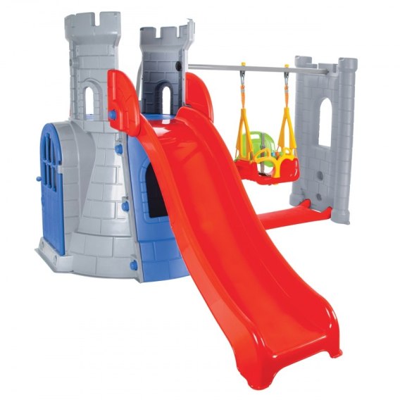 Plac Zabaw Zamek jest ogromną twierdzą do zabawy dla Twojego dziecka i jego przyjaciół! Plac zbudowany jest z wieży ze zjeżdżalnią oraz huśtawki typu swing. Wieża posiada liczne okna i otwory, przez które wpada dużo światła. Dodatkowo można z niej wyjść przez boczne drzwi i za pomocą schodków z trwałymi poręczami wejść na górę wieży i zjechać ze zjeżdżalni o długości ślizgu 166 cm. Wieża posiada wysokie boczne zabezpieczenia chroniące dziecko podczas korzystania ze zjeżdżalni, która ma długi, dość stromy śliz w pełni zadowalający każde dziecko. Cudowny plac uzupełnia miejsce z huśtawką typy swing, którą można ustawić na trzy sposoby zależnie od wieku i potrzeb (maksymalne obciążenie 50 kg). Wykonany jest z wysokiej jakości tworzywa sztucznego zabezpieczonego przed promieniowaniem UV - idealny do użytku na zewnątrz oraz doskonały do zabawy w domu!