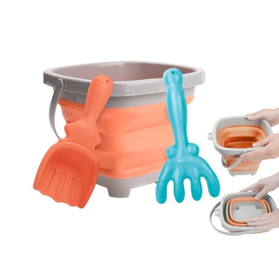Góra, spód i rączka wiaderka są plastikowe, a ścianki wykonane są z grubego silikonu składanego harmonijkowo. Plastikowe są również grabki i łopatka.