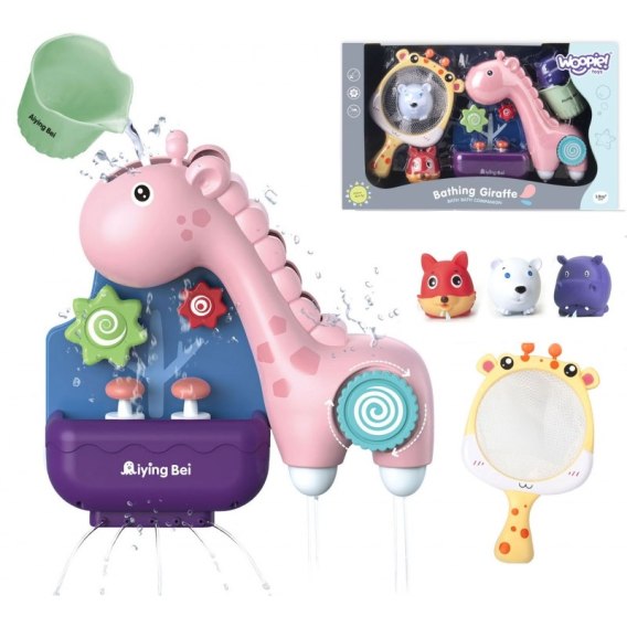 Zabawka wodna Żyrafka od marki WOOPIE zapewni ciekawy czas dla dziecka podczas kąpieli. Dziecko za pomocą kubeczka wlewa do główki żyrafki wodę. Podczas wlewania wody kręcić się będą 3 elementy (kółko na żyrafie oraz 2 pod głową). Dodatkowo, gdy zbiornik się napełni to automatycznie wysuwają się 2 grzybki. Woda na końcu leci strumieniem z nóżek żyrafy i ze zbiornika z grzybkami. Na plecach zabawka posiada 3 przyssawki, dzięki czemu można przyczepić ją do ściany w łazience lub do wanny. W zestawie znajdują się również 3 gumowe zwierzątka i siatka do ich łowienia. Zabawka nie tylko umili czas podczas kąpieli, ale również rozwinie wyobraźnię, zdolności manualne u dziecka oraz rozwinie świadomość otaczającego go świata, a przede wszystkim pozwoli dziecku skoncentrować się i zająć czymś podczas mycia.