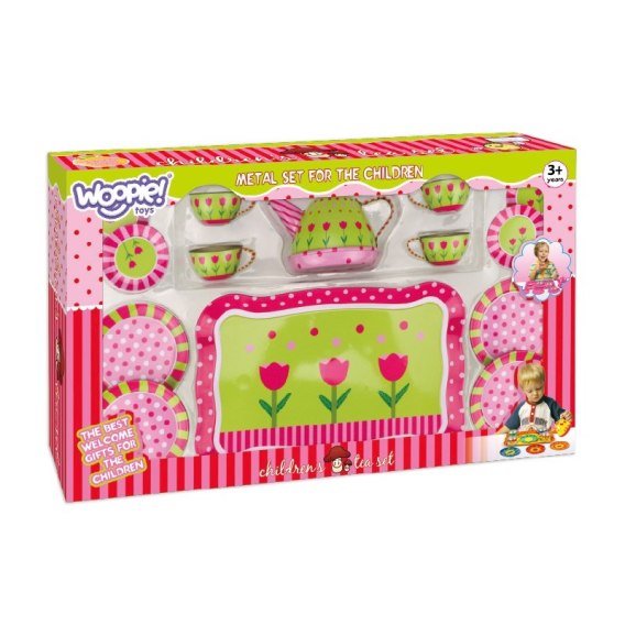Zestaw do herbaty firmy Woopie to coś czego Twój maluch potrzebuje. Zestaw jest metalowy co daje pewność że nie zniszczy się tak szybko, nawet przy upadku. W pudełku jest dzbanuszek, filiżanki, talerzyki i talerze oraz duża tacka z namalowanymi kwiatuszkami. Zestaw przeznaczony dla dzieci od 3 roku.