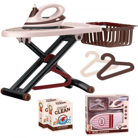 Zestaw do Prasowania od marki WOOPIE doskonale imituje rzeczywiste urządzenia. W zestawie znajdziemy żelazko, deskę do prasowania, kosz na pranie, dwa wieszaki oraz dwa opakowania proszku na pranie. Żelazko jest zabawką bezpieczna dla dzieci, ponieważ nie nagrzewa się. Zostało ono wyposażone w wiele funkcji, które urozmaicą zabawę: świecącą lampkę LED, wibracje, efekty dźwiękowe oraz funkcję spryskiwania po napełnieniu żelazka wodą. Zabawka działa także bez napełniania wodą. Dzięki zastosowanemu czujnikowi żelazko wibruje, gdy będzie położone na płaskiej powierzchni i podczas przesuwania po niej. Jest to doskonały zestaw dla dzieci, które uwielbiają naśladować rodziców podczas codziennych czynności.