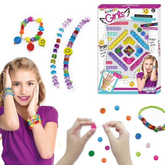 Zestaw do Robienia Biżuterii od marki WOOPIE jest stylowym, kreatywnym i zjawiskowym zestawem dla każdego dziecka. Dziecko samodzielnie może mieszać i dopasowywać różne koraliki oraz zawieszki, aby stworzyć swoja niepowtarzalna bransoletkę lub wisiorek. Zestaw zawiera różnego rodzaju elementy: koraliki różnej wielkości, guziki, gwiazdki, uśmiechy, koraliki z literkami oraz żyłki. Komplet zapakowany jest w kolorowe pudełko idealne na prezent. Po rozpakowaniu zestaw jest łatwo przenośny jest lekki i poręczny, co sprawia, że dziecko z łatwością może go zabrać ze sobą do przedszkola, do kolegi, do ogrodu. Opakowanie, również posiada formę organizera, co pozwoli na bezpieczne przechowywanie małych elementów znajdujących się w zestawie. Zabawa w tworzenie biżuterii pozytywnie wpływa na rozwój dziecka, kształtuje jego zdolności plastyczne wraz z rozwojem wyobraźni oraz kreatywności, ćwicząc jednocześnie koncentrację; rozwija zdolności manualne/motoryczne tzw. "małą motorykę" (ruch rączek), a także przy zabawie z przyjaciółmi uczy współpracy, dzielenia się i usprawnia zdolności społeczno-integracyjne.