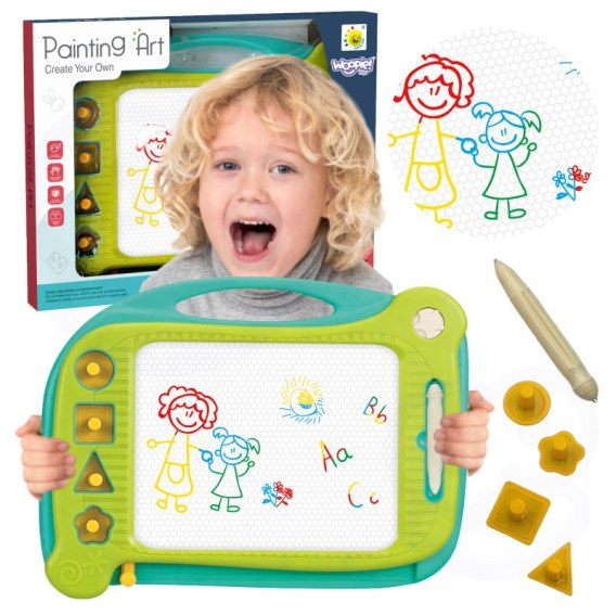 Znikopis Tablica Magnetyczna daje możliwość kreatywnej zabawy na długi czas! Tablica zachęca do pisania i rysowania. Rysowanie pozwoli skoncentrować, wyciszyć i uspokoić Twoje dziecko. Znikopis pozwala na tworzenie nieskończonej ilość obrazków - wystarczy przejechać specjalnym suwakiem, a rysunek zniknie i można rysować od nowa! Zestaw dodatkowo zawiera wygodny magiczny długopis oraz 4 stempelki, które urozmaicą dzieło. Tablica posiada wygodny uchwyt, dzięki czemu dziecko może zabrać ją wszędzie. Znikopis rozwinie u dziecka zdolności manualne, wyobraźnie, kreatywność oraz da szansę na rozwinięcie artystycznej strony dziecka!