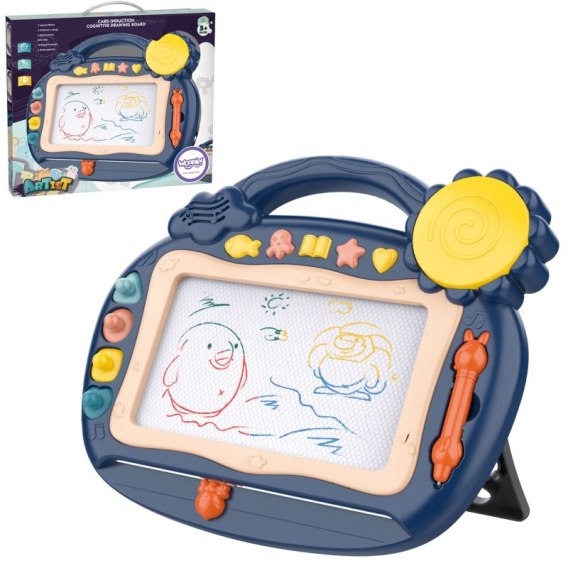 Znikopis Tablica Magnetyczna daje możliwość kreatywnej zabawy na długi czas! Tablica zachęca do pisania i rysowania. Rysowanie pozwoli wyciszyć i uspokoić się Twojemu dziecku. Znikopis pozwala na tworzenie nieskończonej ilość obrazków - wystarczy przejechać specjalnym suwakiem, a rysunek zniknie i można rysować od nowa! Zestaw dodatkowo zawiera wygodny długopis oraz aż 4 stempelki, które urozmaicą dzieło. Dodatkowo 5 multi funkcyjnych guzików, które mają ponad 400 opcji dźwiękowych, w tym: efekty dźwiękowe, taneczne piosenki dla dzieci, elektroniczne dźwięki, alfabet angielski oraz bęben. Tablica posiada wygodny uchwyt, dzięki czemu dziecko może zabrać ją wszędzie oraz posiada możliwość wystawienia nóżek, które ułatwia dziecku pisanie przy stole. Znikopis rozwinie u dziecka zdolności manualne, wyobraźnie, kreatywność oraz da szansę na rozwinięcie artystycznej strony dziecka!