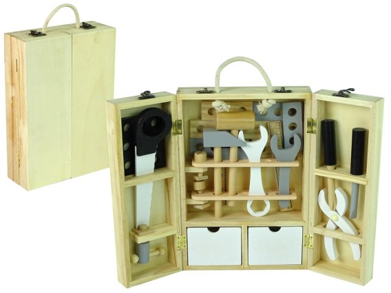 Zabawka jest łatwa w przenoszeniu, można ją również zawiesić na stanie, dzięki uchwytowi na sznurku. Klasyczne drewno oraz jego wytrzymałość sprawiają, że od zawsze cieszy się ono ogromnym uznaniem. Surowiec ten wygląda dobrze zarówno w naturalnym kolorze, jak i pomalowany. W tym przypadku pomalowany jest na szary, czarny i biały. Wewnątrz skrzynki znajdują się odpowiednie szufladki i przegrody, dzięki czemu narzędzia będą poukładane i na swoim miejscu. Można je zabrać również ze sobą, gdzie wspólnie z rówieśnikami możesz naprawiać lub rozkręcać zabawki. Cała walizka jest zamykana na klamry.