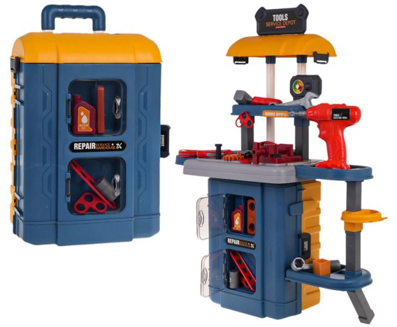 Bogato wyposażony zestaw małego majsterkowicza dla dzieci od 3-go roku życia. Zestaw wykonany został z wysokiej jakości plastiku i składa się z 46 elementów. Części konstrukcyjne zestawu możemy układać w 3 różnych układach. W pierwszym układzie powstanie duży warsztat ze stołem na narzędzia. W drugim mały, przenośny warsztat, a w trzecim układzie powstanie duża walizka z rączką do przenoszenia, w której możemy zmieścić wszystkie narzędzia. W zestawie prócz części konstrukcyjnych znajduje się również: wkrętaka na baterie z ruchomym wiertłem, imadło, młotek, piłka, klucze, śrubokręt, śrubki czy też kanister. Wkrętarka zasilana jest bateriami typu 2 x AA 1,5 V (brak w zestawie). Funkcje zestawu: - przeznaczony dla dzieci powyżej 3-go roku życia, - wykonany z wysokiej jakości plastiku, - możliwość ułożenia 3 układów: duży warsztat, mały przenośny warsztat, walizka z rączką, - wkrętarka z wymiennymi bitami, zasilana bateriami, wkręca i wykręca oraz wydaje charakterystyczne odgłosy, - ruchome w prawo i lewo imadło, - bogate wyposażenie aż 46 elementów. |