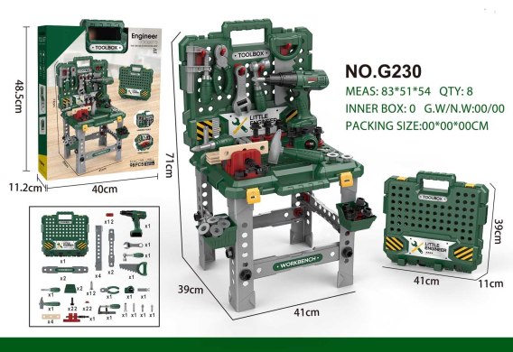 - warsztat ok. 41 cm x 39 cm x 71 cm, - walizka ok. 41 cm x 11 cm x 39 cm, - wiertarko-wkrętarka ok. 19,5 cm x 19 cm x 6 cm, - imadło ok. 16,5 cm x 6,5 cm x 8,5 cm, - śrubokręt ok. 14 cm x 4 cm, - młotek ok.14,5 cm x 9 cm x 3 cm, - piła ręczna ok. 20,5 cm x 10 cm x 2 cm, - obcęgi ok. 14 cm x 6 cm x 2 cm, - klucz francuski ok. 14 cm x 5,5 cm x 2 cm, - ścisk ok. 16 cm x 7 cm x 4 cm, - klucz do śrub ok. 14,5 cm x 6 cm x 3 cm, - miarka ok. 7,5 cm x 5,5 cm x 4,5 cm, - 4 x elementy do wkręcania ok. 20 cm x 4 c, x 1 cm, - śruby ok. 5,5 cm x 3 cm, - nakładki ok. 3 cm, - kołki rozporowe ok. 6 cm x 3 cm, - haczyki ok. 5,5 cm x 5 cm, - opakowanie ok. 40 cm x 11,5 cm x 49 cm. |
