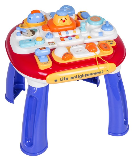 Wielofunkcyjny interaktywny stolik z efektem dźwięku i światła dla dzieci od trzeciego roku życia. Zestaw wykonano z najlepszej jakości tworzywa sztucznego w żywych kolorach. Zestaw nie posiada ostrych zakończeń i jest w pełni bezpieczny dla dzieci. Nóżki stoliczka można odpiąć i zabrać blat wszędzie ze sobą. Dodatkowo nóżki stoliczka posiadają antypoślizgowe podstawki, by zabawka nie przemieszczała się podczas zabawy. Na blacie stoliczka znajduje się wiele elementów manipulacyjnych do wciskania, przesuwania, ciągnięcia i otwierania. Efekty dźwiękowe i świetlne stymulują zmysły maluszka. Zabawka zasilana jest bateriami typu 3 x AA 1,5V (brak w zestawie).