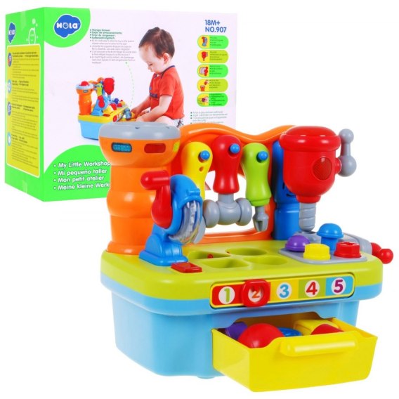 Multifunkcyjna zabawka przeznaczona dla dzieci od 18-go miesiąca życia. Warsztat majsterkowicza wyposażony jest w szereg rozmaitych funkcji. Znajdziemy tu obracającą się tarczową piłę oraz wiertarkę. Każde z narzędzi wyposażone jest w praktyczna rączkę, za pomocą której uruchomimy każde z narzędzi. Na bocznej ścianie zamontowano imadło, które pozwoli naszemu maluszkowi nauczyć się odruchu przykręcania i odkręcania, czemu będą towarzyszyć odgłosy grzechotania. W warsztacie znajdziemy gwoździe do wbijania i śrubki do przykręcania. Dodatkowe wyposażenie to narzędzia: śrubokręt, klucz francuski i młotek, wszystko w proporcjach znakomicie nadających się do małych dziecięcych rączek. Warsztat to również znakomite miejsce do ćwiczenia umiejętności rozpoznawania kształtów i dopasowywania ich do siebie. Blat warsztatu wyposażono w sorter, znakomicie rozwijający umiejętności dziecka. Jeśli maluszek dopasuje kształt klocka do kształtu wyciętego w blacie, usłyszy w nagrodę jaki kształt dopasował. Jako dodatkowy element urozmaicający zabawę - możemy pobawić się w trafianie do celu. Wsuńmy kulkę w cylinder umieszczony obok narzędzi, jeśli przepchniemy kuleczkę głębiej, w nagrodę usłyszymy wesołą melodyjkę. Wszystkie elementy, które dopasujemy do odpowiednich otworów, znajdziemy w praktycznej szufladzie zabawki. Z przodu naszego warsztatu znajduje się zagadkowy suwaczek, jeśli nim poruszymy nauczymy się liczyć do 5. Dodatkowy atut zabawki to możliwość regulacji natężenia głośności. Wesołej zabawie towarzyszą mrugające światełka. Zabawka posiada angielską wersję językową. Ta wielofunkcyjna zabawka edukacyjna jednocześnie rozwija wyobraźnię, zdolności manualne oraz koordynację ruchową malucha. Poprzez zabawę maluch uczy się logicznego myślenia, rozpoznawania kształtów i kolorów, posługiwania się przedmiotami i dopasowywania ich od siebie. |