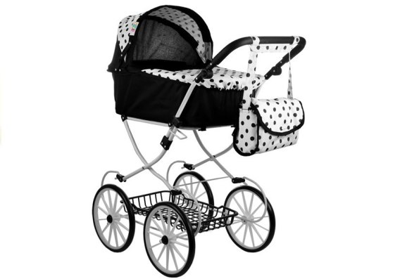 Czarno-biały retro wózek posiada ozdobny detal, jakim są groszkami w kontrastującym kolorze, umieszczone między innymi na daszku, pokrywie gondoli czy torbie — co dodaje mu dużego uroku. Retro wózeczek z pewnością zainteresuje i zachęci do zabawy każdą małą opiekunkę — gwarantują to wymiary dopasowane do przeciętnego wzrostu kilkuletnich dziewczynek, a także wzornictwo inspirowane budową prawdziwych wózków dla dzieci. Co istotne — prezentowany retro model może rosnąć razem z dzieckiem, ponieważ posiada rączkę z możliwością regulowania jej wysokości. Wózek będzie odpowiedni dla wszystkich lalek i zabawek o maksymalnej długości 69 cm — duże wymiary gondoli z łatwością pomieszczą kilku zabawkowych pasażerów.